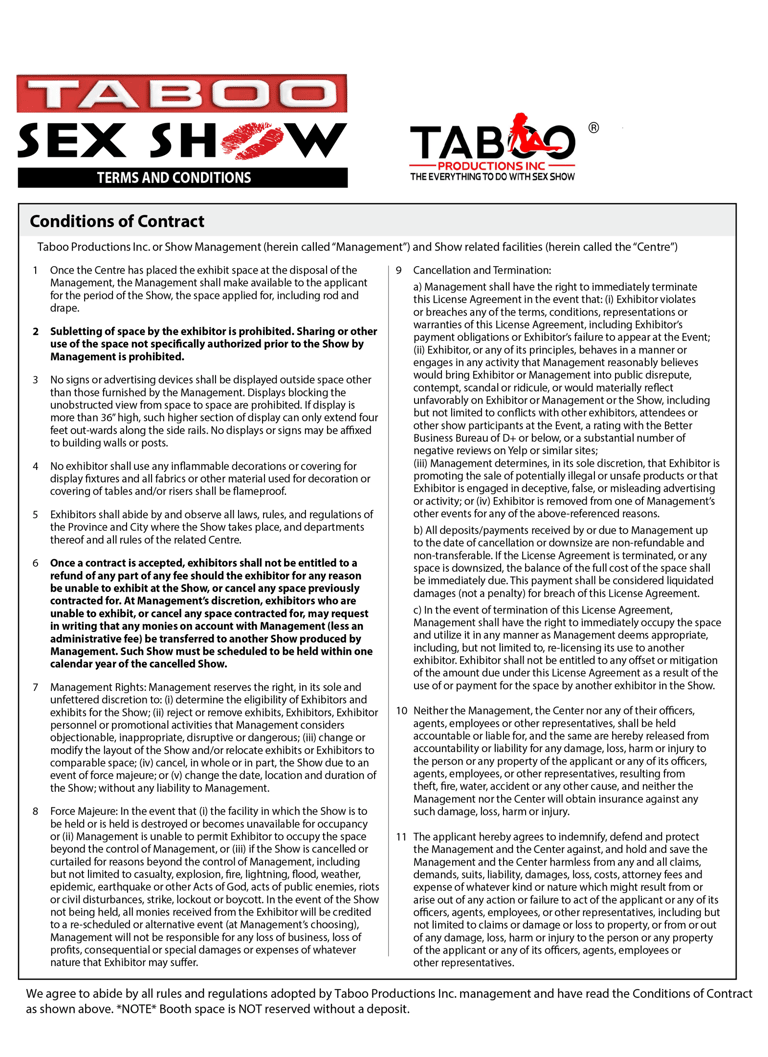 General Character and/or Company slights, abuse of any Taboo Show Staff or insults of any kind will not be tolerated. Any exhibitor responsible will have their exhibit space canceled (non-refundable) from the Show.