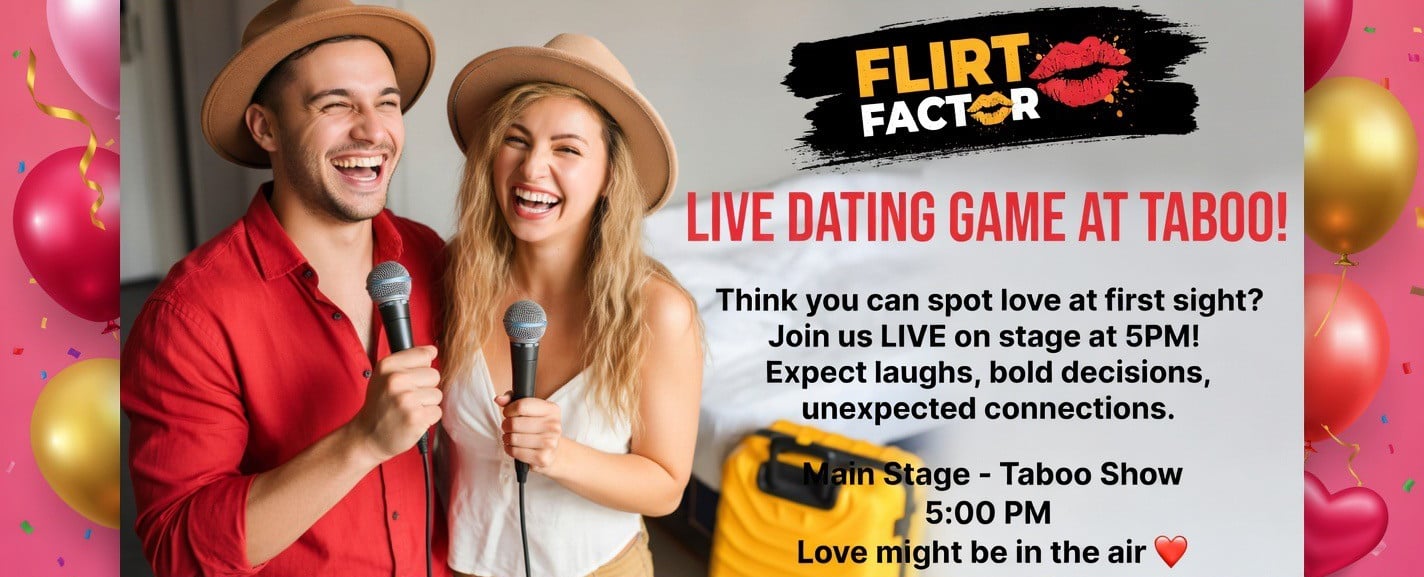 Join us LIVE on stage at 5PM for Flirt Factor, the interactive dating game where singles take their shot at romance… and maybe walk away with some prizes too. Inspired by the viral “Pop the Balloon” style dating game, contestants will reveal their chemistry in real time as potential matches decide if the spark is there — or if the balloon pops! 🎈💥