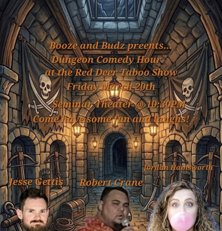 Booze and Budz presents the Dungeon Comedy Hour at Taboo Seminar Theatre Friday March 20th at 10:30pm. Enter the Dungeon if you dare, with local comedians, Rob Crane, Jesse Gettis, and Jordan Hainsworth. Come grab a drink, have some fun and laugh until it hurts.