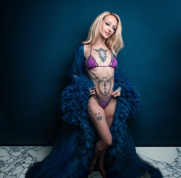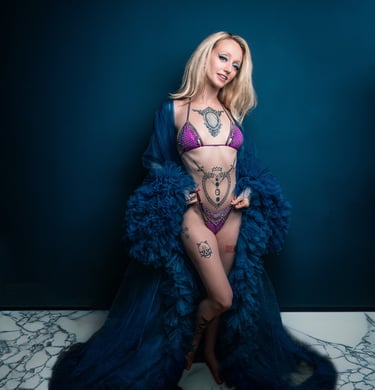Lina Sol is a Neo burlesque artist bringing Latin fusion to the spotlight with unapologetic fire. Inspired by the music of her Latin American roots, she crafts performances that are sensual, vibrant, and electric with movement. Her body is a canvas—inked with tattoos that speak of freedom and rebellion—while her costumes are her own creations, stitched by hand to embody her vision. With every spin, shimmy, and slow reveal, Lina Sol celebrates strength, desire, and self-expression.